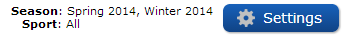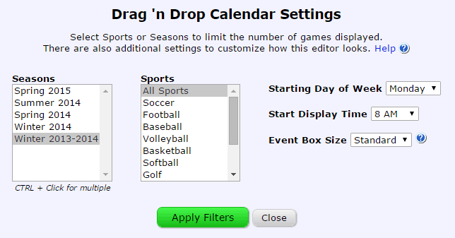 In the upper right corner, there is a Settings button where you can customize the Drag 'n Drop Calendar. The two main settings are choosing which Seasons and Sports to display games from. The chosen Season/Sports are always listed to the left of Settings button.