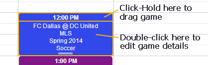 another day/time/location. In Day or Week view, you must click-hold on the top "time" portion of the game box (see below).